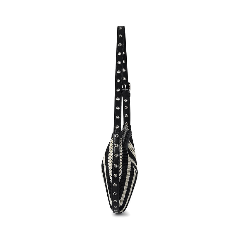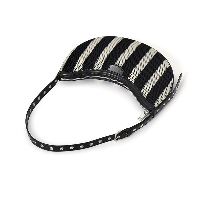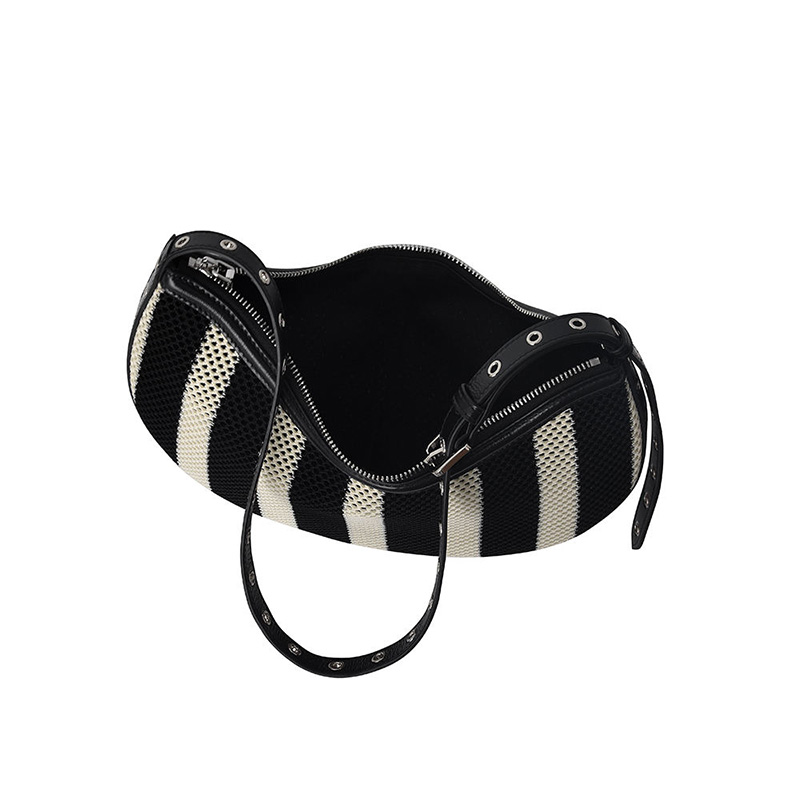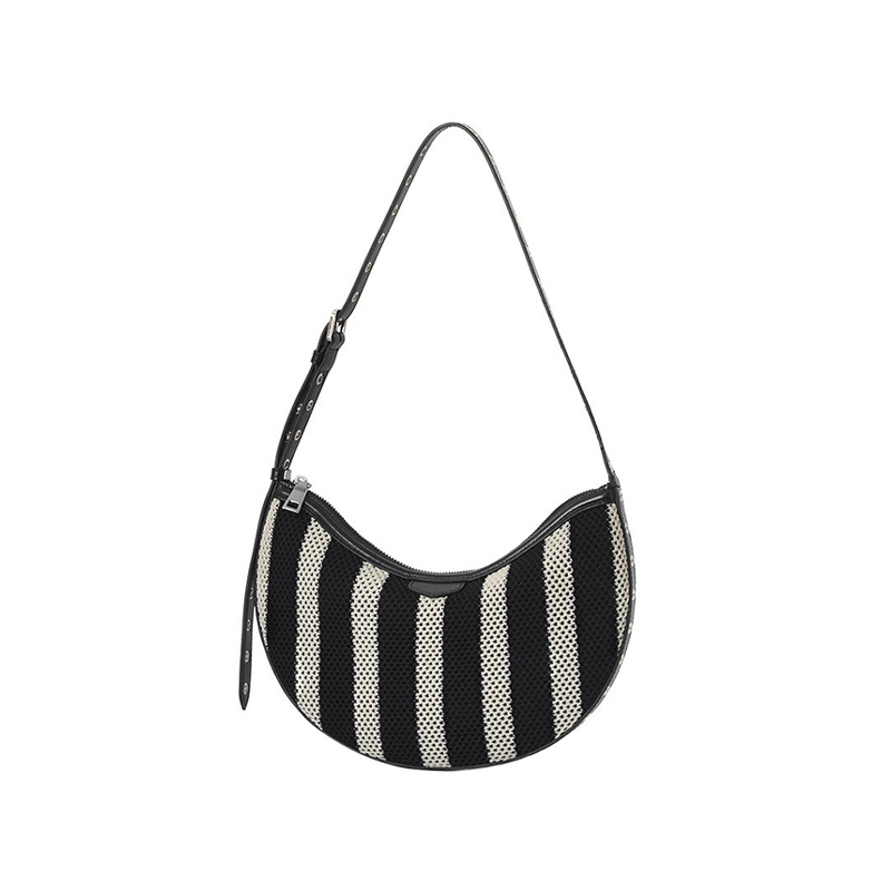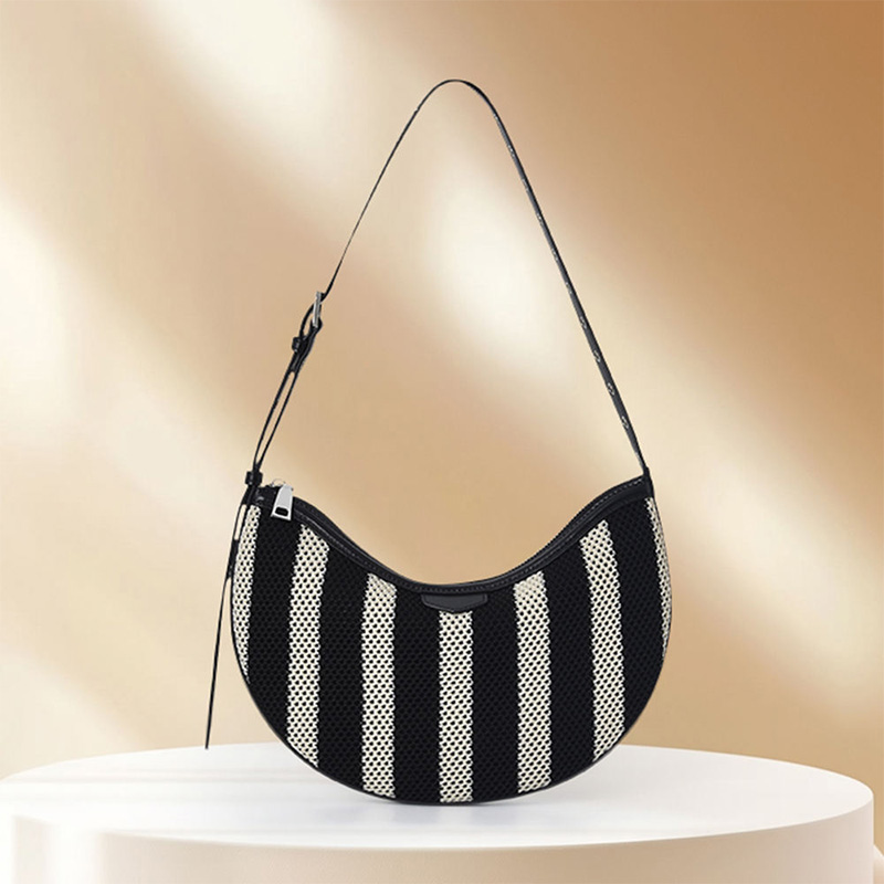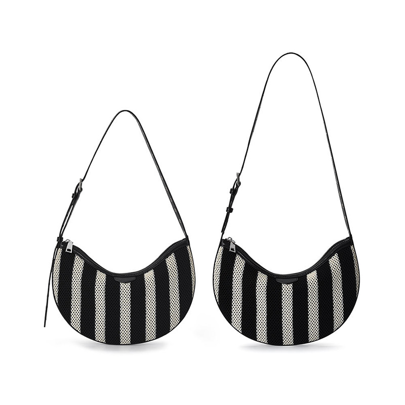 This crossbody bag features stripes and a half-moon design, creating a simple, elegant, and stylish look that balances practicality and aesthetics. The unique half-moon shape not only accentuates the bag's soft curves but also enhances the overall look. The top zipper closure is convenient and secure, preventing items from falling out.